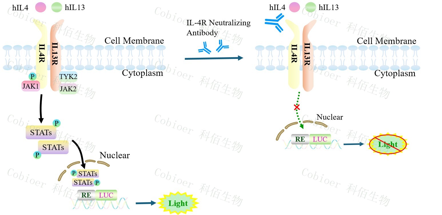 IL4/IL13 Effector Reporter Cell 報告基因藥靶模型很好的模擬了體內 IL4/IL13 的信號轉 導過(guò)程,原理見(jiàn)下圖所示。