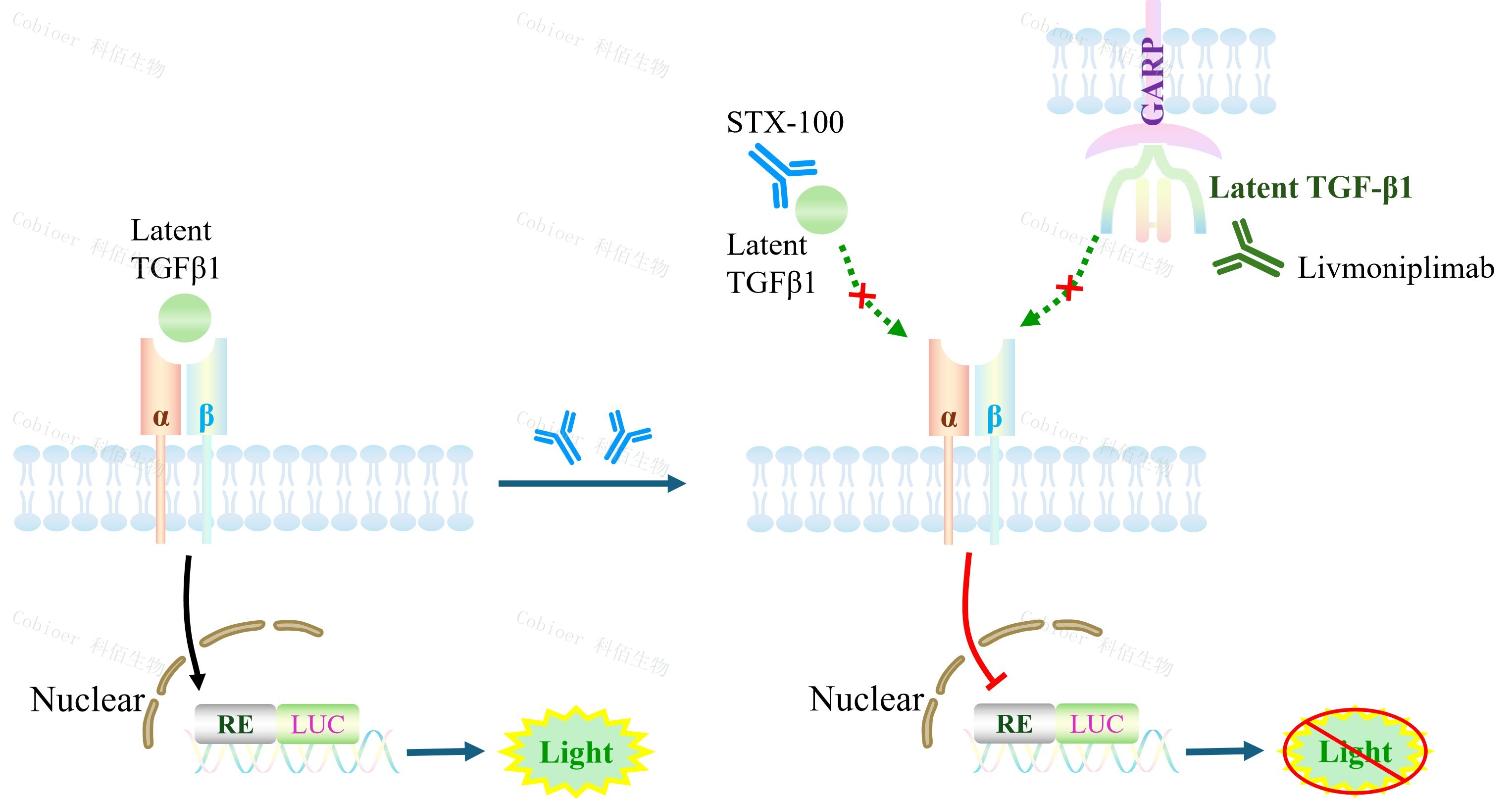 Integrin αvβ6 Effector Reporter Cell 報告基因藥靶模型很好的模擬了體內αvβ6 的信號轉 導過(guò)程,原理見(jiàn)下圖所示。