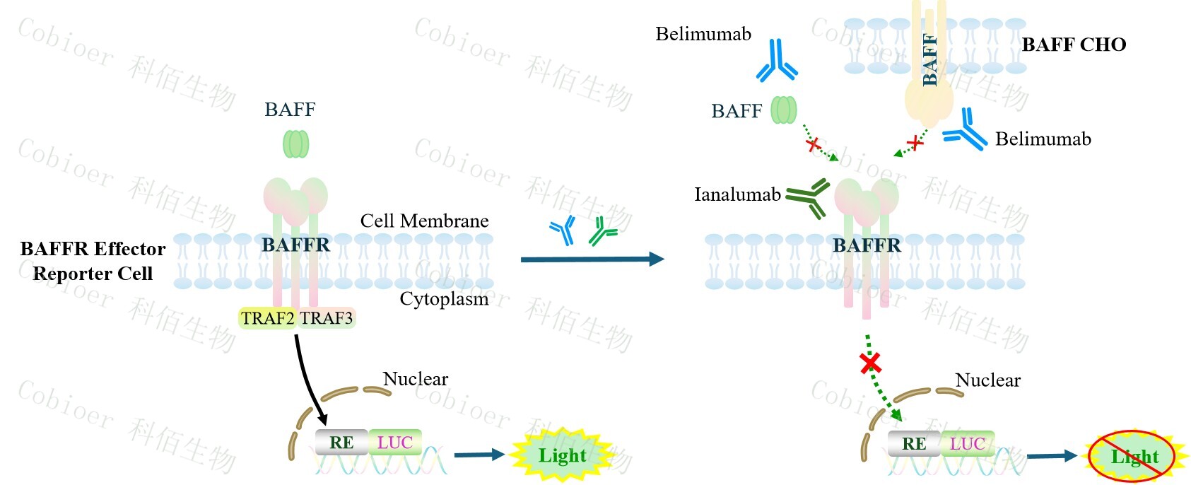 BAFFR Effector Reporter Cell 報告基因藥靶模型很好的模擬了體內 BAFF 的信號轉導過(guò)程,原理見(jiàn)下圖所示。![]() Figure 1. BAFFR Effector Reporter Cell 細胞模型原理圖 |