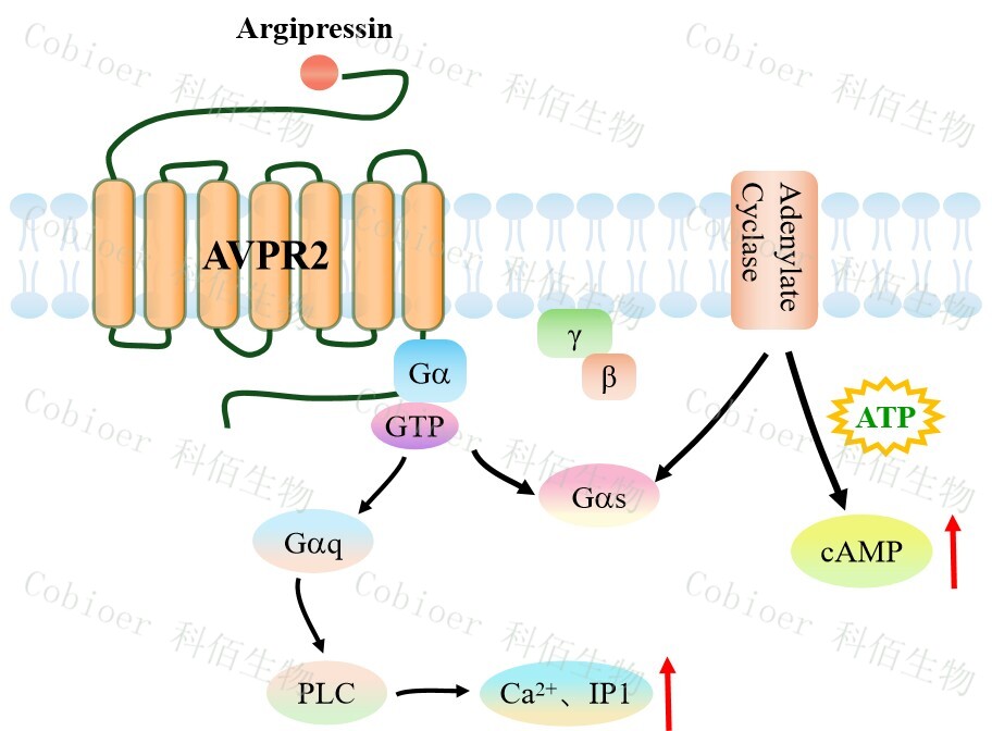 AVPR2(精氨酸加壓素受體 2 型)是一種主要分布于腎臟集合管上皮細胞基底側的 G 蛋白偶聯(lián)受體(GPCR),屬于加壓素/催產(chǎn)素受體家族,其特異性配體為垂體后葉分泌的 精氨酸加壓素(AVP,又稱(chēng)抗利尿激素 ADH);該受體通過(guò)偶聯(lián) Gs 蛋白,激活腺苷酸環(huán) 化酶,升高 cAMP,激活蛋白激酶 A(PKA),最終磷酸化并促使水通道蛋白 AQP2 向細 胞膜轉位,從而增加水的重吸收、濃縮尿液并維持體液平衡;其功能缺陷是 X 連鎖隱性遺 傳性腎性尿崩癥(NDI) 的主要病因(占 90%),患者因基因突變導致受體失活,表現為 多尿、煩渴及低滲尿,而獲得性異常則與鋰中毒或梗阻性腎病相關(guān);此外,AVPR2 作為藥 物靶點(diǎn),其拮抗劑(如托伐普坦)已用于治療低鈉血癥和心力衰竭的體液潴留。