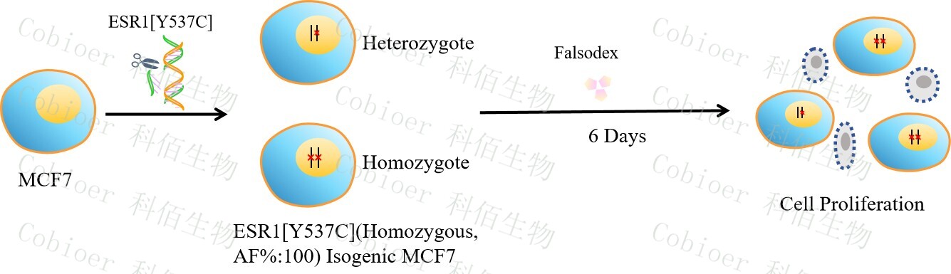 ESR1[Y537C](Homozygous,AF%:100) Isogenic MCF7 藥靶細胞,通過(guò)基因編輯的方式將 ESR1 的 537 位氨基酸酪氨酸(Y)突變?yōu)榘腚装彼幔–)。![]() Figure 1. ESR1[Y537C](Homozygous,AF%:100) Isogenic MCF7 原理示意圖 |