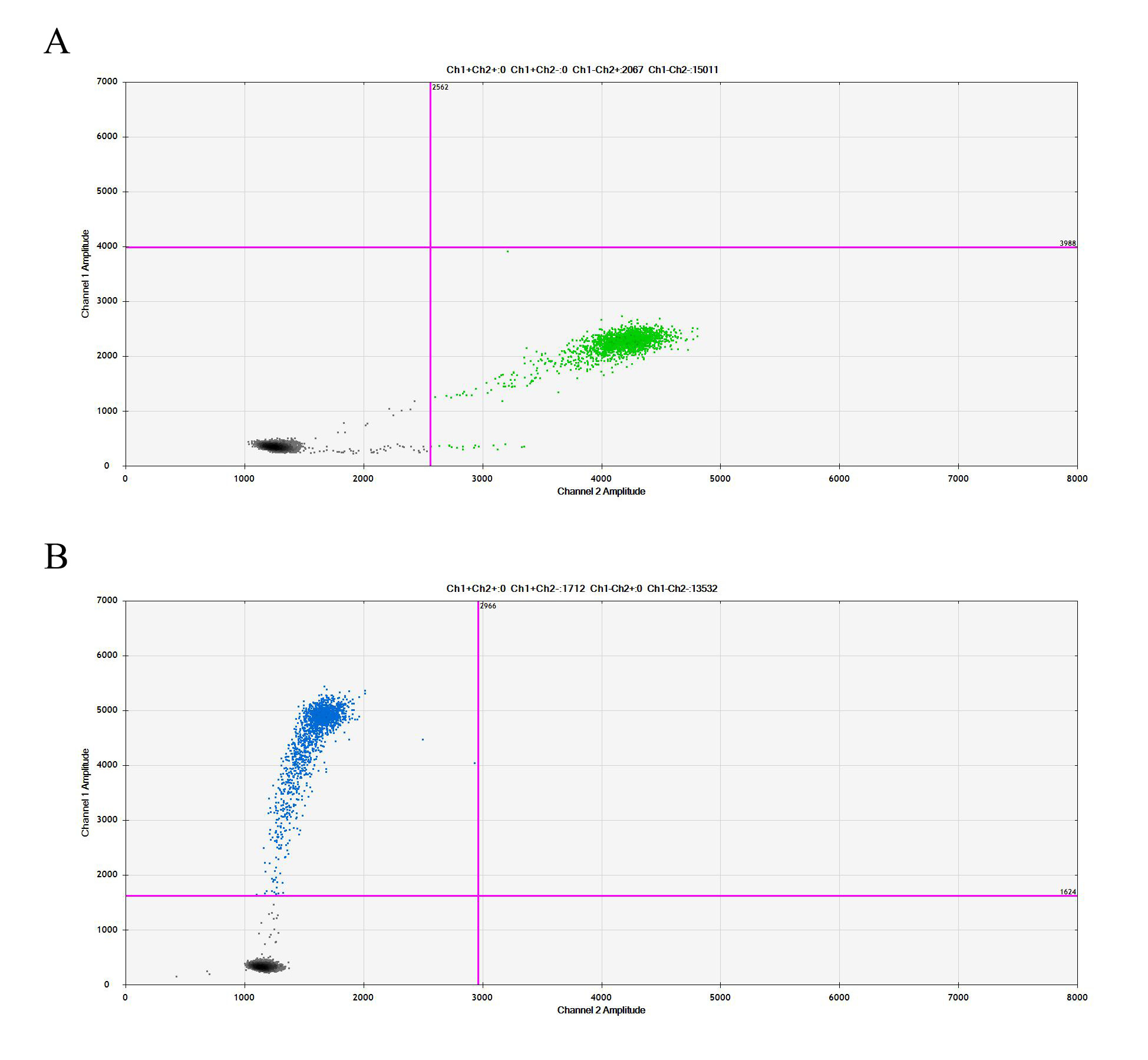 ![]() Figure 2. Sanger of ESR1[Y537C](Homozygous,AF%:100) Isogenic MCF7. ![]() Figure 3. A: MCF7 Parental Cell;B:ESR1[Y537C](Homozygous,AF%:100) Isogenic MCF7 通道2 藍色微滴代表ESR1[Y537C]突變陽(yáng)性,通道2 綠色微滴代表該位點(diǎn)為陰性野生型 ![]() Figure 4. CTG Proliferation Assay of ESR1[Y537C](Homozygous,AF%:100) lsogenic MCF7(2C40). |