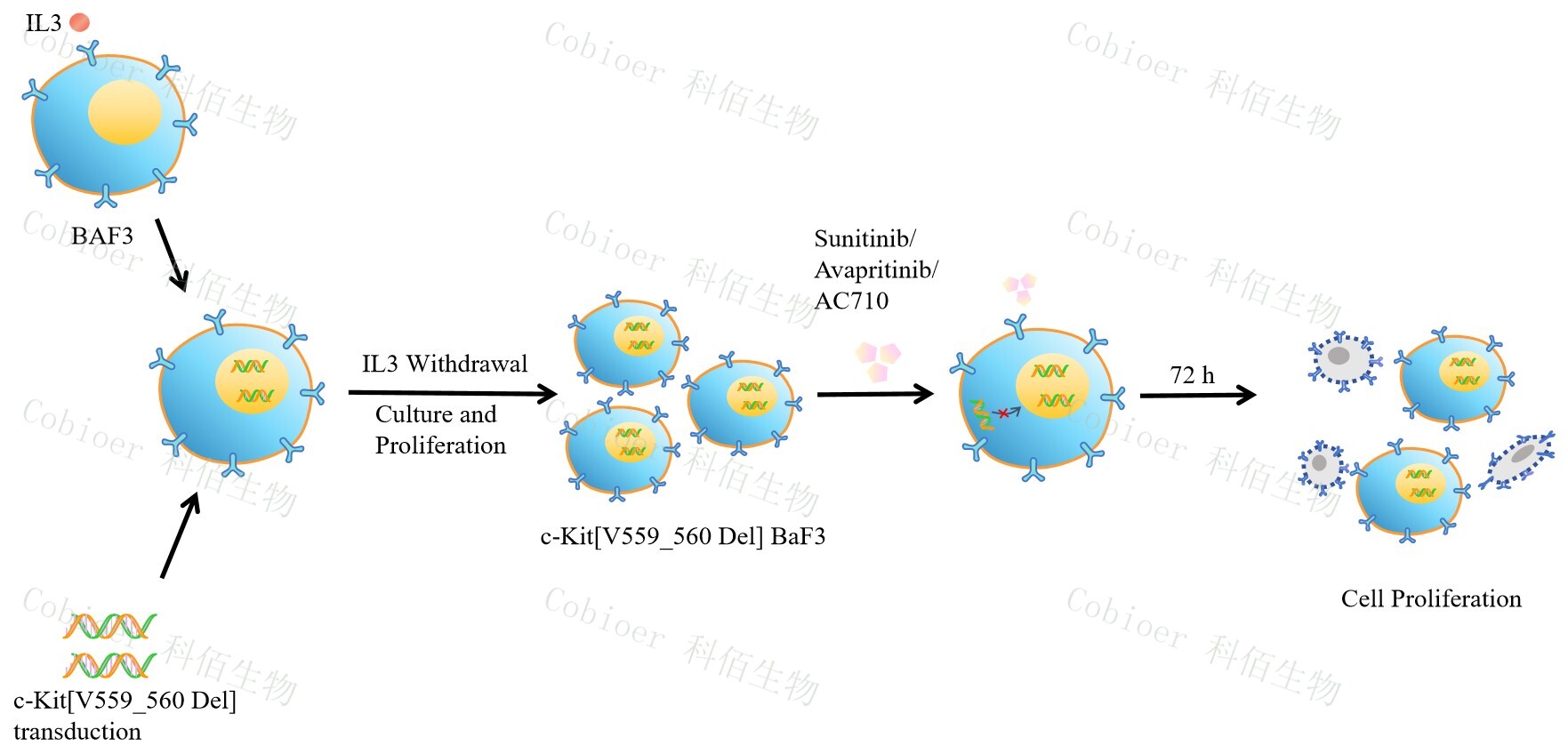 c-Kit[V559_560 Del] BaF3 藥 靶 細 胞 , 通過(guò)轉導缺失狀態(tài)的 c- Kit[V559_560 Del] 基因到 BaF3 細胞系中,穩定表達人缺失形態(tài)下的 c-Kit[V559_560 Del] 基因。