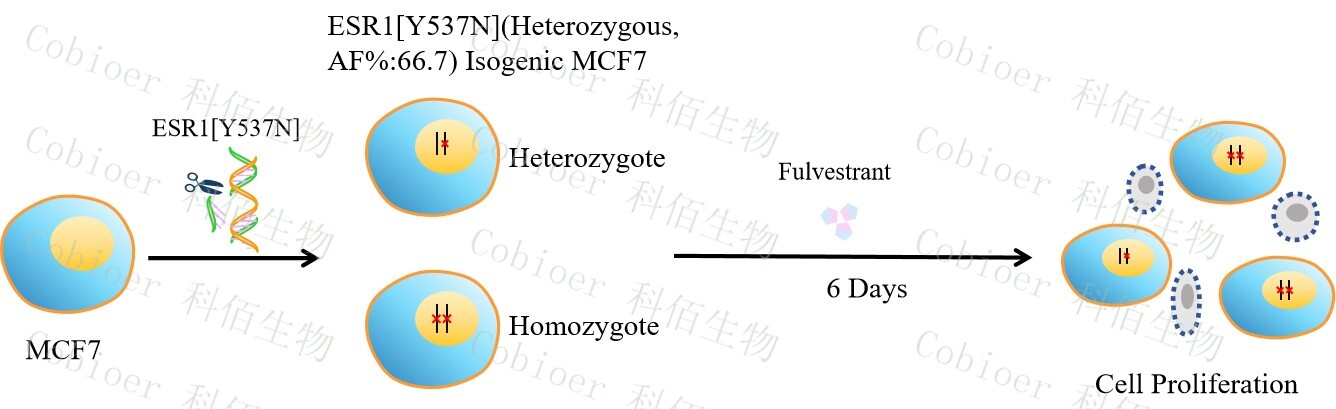 ESR1[Y537N](Heterozygous,AF%66.7) Isogenic MCF7 藥靶細胞,通過(guò)基 因編輯的方式將 ESR1 的 537 位氨基酸酪氨酸(Y)突變?yōu)樘於0罚∟)。![]() Figure 1. ESR1[Y537N](Heterozygous,AF%66.7) Isogenic MCF7 原理示意圖 |