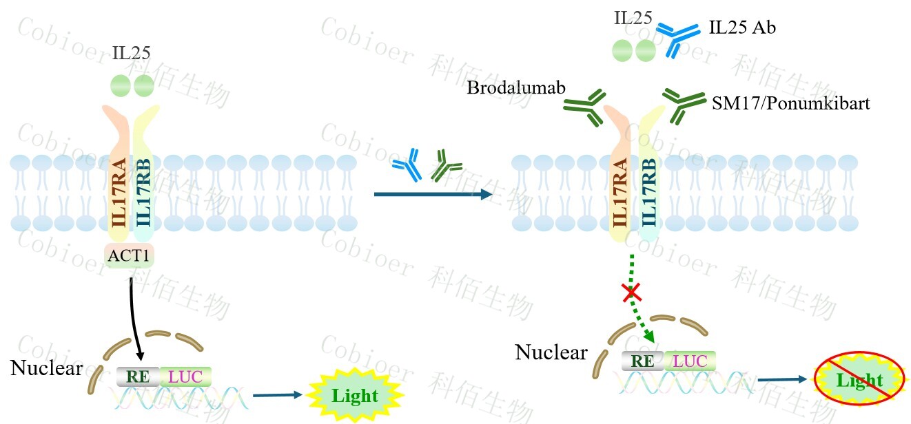 IL25 Effector Reporter Cell(Suspension)報(bào)告基因藥靶模型很好的模擬了體內(nèi) IL25 的信號(hào)轉(zhuǎn)導(dǎo)過(guò)程,原理見(jiàn)下圖所示。![]() Figure 1. IL25 Effector Reporter Cell(Suspension)細(xì)胞模型原理圖 |