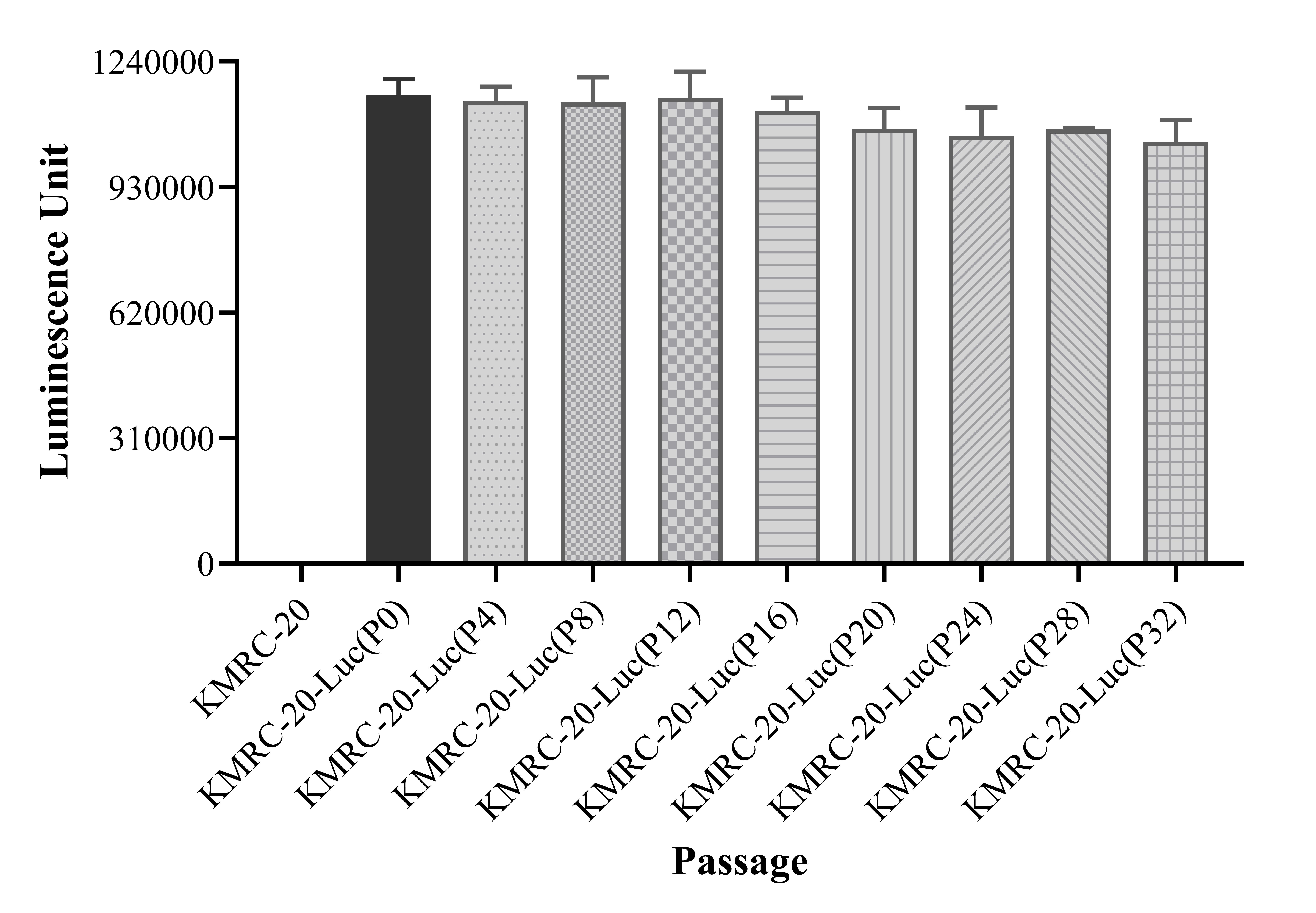 Figure 1. Stablity test results.KMRC-20-Luc showed at least 32 passage stability with similar luminescence unit. |