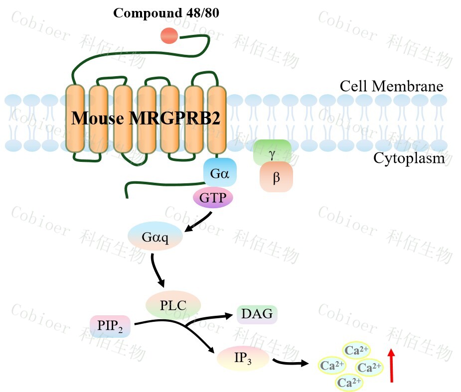 Mouse MRGPRB2 Gα15 HEK293 細胞,在 Gα15 HEK293 細胞上,穩定表達鼠的 MRGPRB2。Mouse MRGPRB2 Gα15 HEK293 細胞藥靶模型很好的模擬了體內 MRGPRB2&Gα15 的信號轉導過(guò)程,原理見(jiàn)下圖所示。