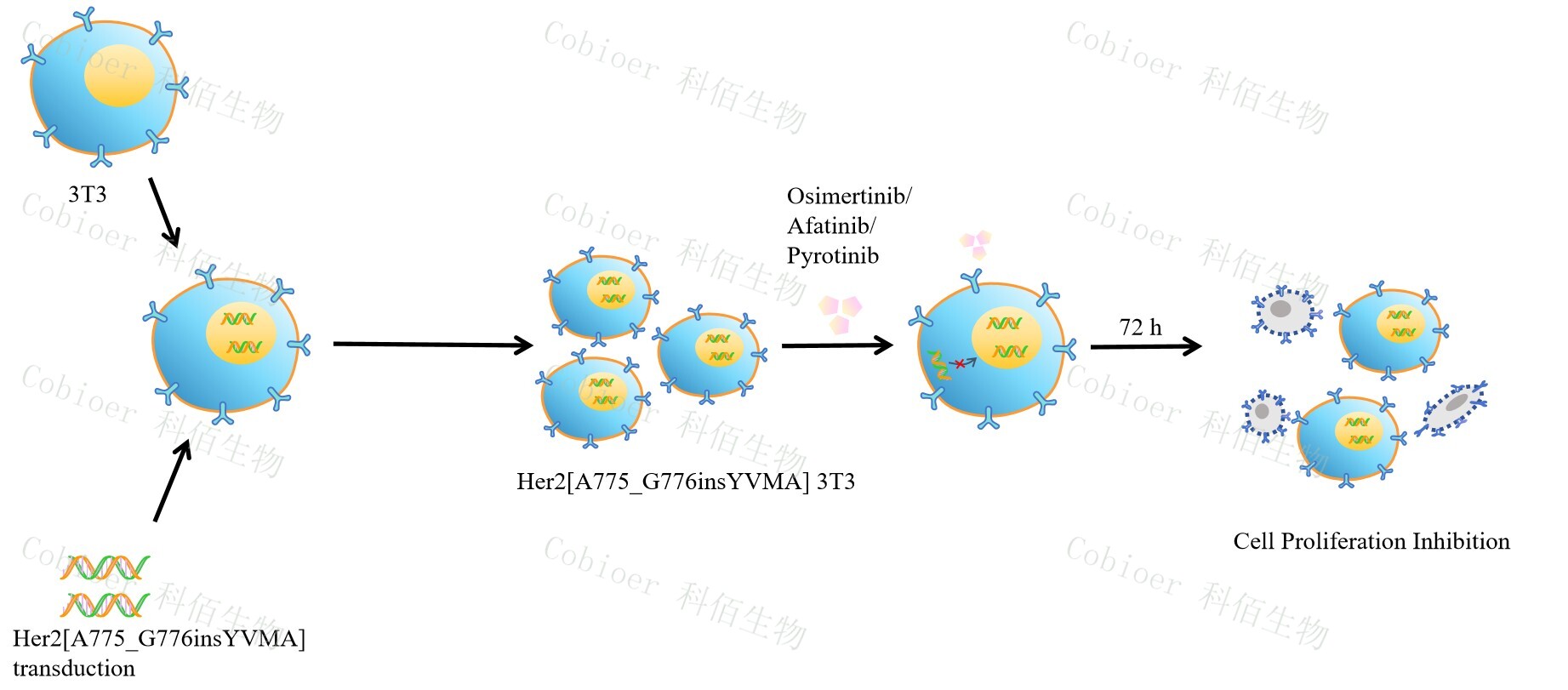 HER2[A775_G776insYVMA] 3T3 藥靶細胞,通過(guò)轉導突變狀態(tài)的 HER2[A775_G776insYVMA] 基因到 3T3 細胞系中 , 穩定表達人突變形態(tài)下的 HER2[A775_G776insYVMA]基因,原理及流程見(jiàn)下圖所示。![]() Figure 1. HER2[A775_G776insYVMA] 3T3 細胞的構建原理圖 |