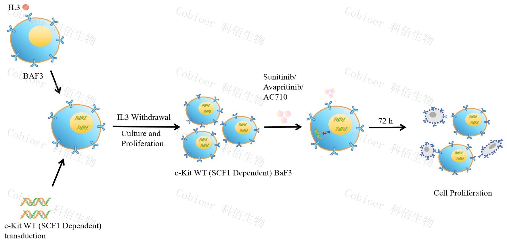 c-Kit WT (SCF1 Dependent) BaF3 藥靶細胞,通過(guò)轉導融合狀態(tài)的 c-Kit WT (SCF1 Dependent) 基因到 BaF3 細胞系中,穩定表達人融合形態(tài)下的 c-Kit WT (SCF1 Dependent) 基因。