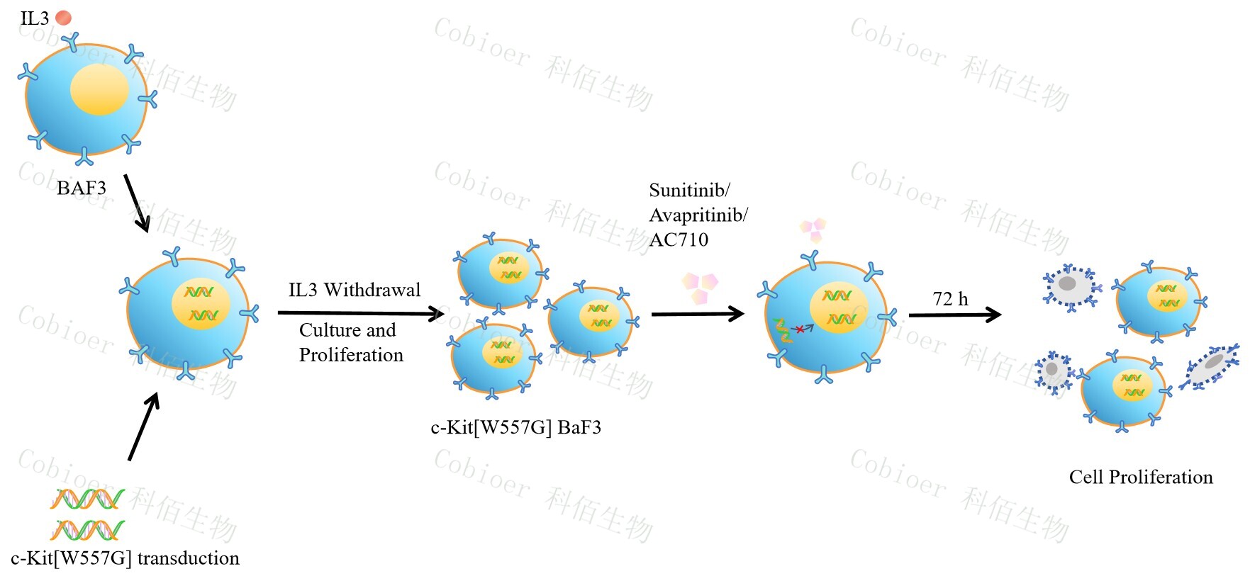 | c-Kit[W557G] BaF3 藥靶細胞,通過(guò)轉導突變狀態(tài)的 c-Kit[W557G] 基因 到 BaF3 細胞系中,穩定表達人突變形態(tài)下的 c-Kit[W557G] 基因。 BaF3(小鼠原 B 細胞)的生長(cháng)和增殖需要 IL-3 的維持。通過(guò)引入各種表達激酶的基因, 能作為 BaF3 的驅動(dòng)基因,讓 BaF3 不再依賴(lài) IL-3 而增殖,進(jìn)而激酶基因成為 BaF3 增殖依 賴(lài)的驅動(dòng)基因,用于評估小分子藥物對激酶的靶向抑制作用,原理及流程見(jiàn)下圖所示。 ![]() Figure 1. c-Kit[W557G] BaF3 細胞的構建原理圖 |