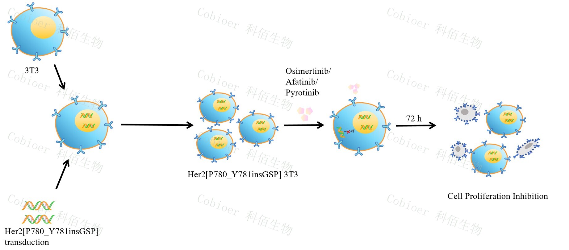 HER2[P780_Y781insGSP] 3T3 藥靶細胞 , 通過(guò)轉導突變狀態(tài)的 HER2[P780_Y781insGSP] 基因到 3T3 細胞系中 , 穩定表達人突變形態(tài)下的 HER2[P780_Y781insGSP]基因,原理及流程見(jiàn)下圖所示。![]() Figure 1. HER2[P780_Y781insGSP] 3T3 細胞的構建原理圖 |