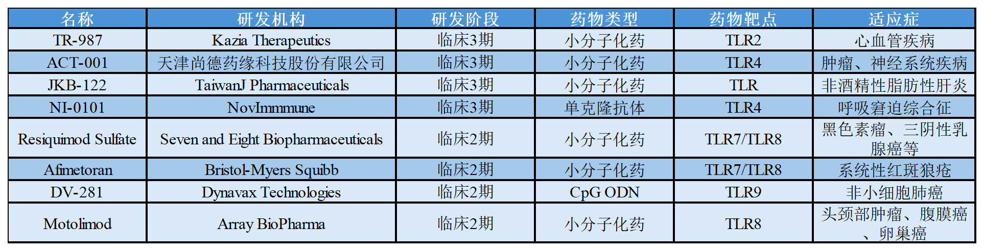 關(guān)于TLRs在研的部分藥物進(jìn)展如下表所示:
