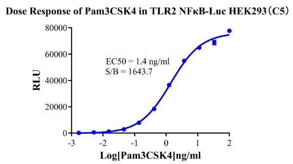 Figure 3.Detect Luciferase assay by Ultra Luciferase Detection Kit CBPH0001(we strongly suggest to purchase from Cobioer). Dose Response of Pam3CSK4 in TLR2 NFκB-Luc HEK293(C5).