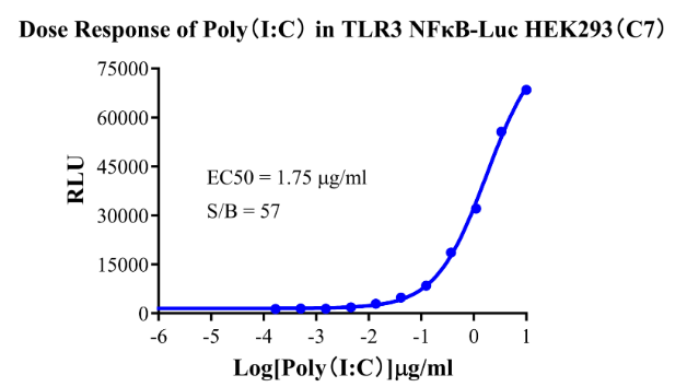 Figure4. Detect Luciferase assay by Ultra Luciferase Detection Kit CBPH0001(we strongly suggest to purchase from Cobioer). Dose Response of Poly(I:C) in TLR3 NFκB-Luc HEK293(C7).