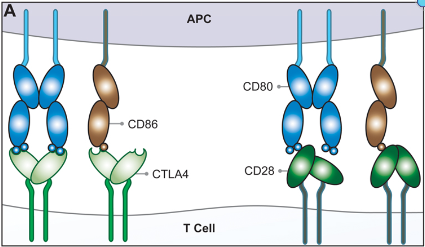 細(xì)胞毒性T淋巴細(xì)胞相關(guān)蛋白4(cytotoxic T-lymphocyte-associated protein 4,CTLA4)也稱為CD152(分化簇 152),是一種蛋白受體,其作為免疫檢查點(diǎn)起作用并下調(diào)免疫應(yīng)答。CTLA4在調(diào)節(jié)性T細(xì)胞中組成型表達(dá),但在活化后僅在常規(guī)T細(xì)胞中上調(diào),這種現(xiàn)象在癌癥中特別顯著。 當(dāng)與抗原呈遞細(xì)胞表面上的CD80或CD86結(jié)合時(shí),它起到“關(guān)閉”開關(guān)的作用。由于T細(xì)胞需要T細(xì)胞受體(TCR)激活和CD28共激活才能成為效應(yīng)T細(xì)胞,CTLA-4通過與CD28競爭共刺激配體CD80和CD86來負(fù)向調(diào)控該過程。其他的免疫檢查點(diǎn)如PD-1與其配體PD-L1和PD-L2結(jié)合,可以傳遞抑制TCR信號的信號。CTLA-4和PD-1的這些效應(yīng)可能迫使殺癌T細(xì)胞退縮進(jìn)入休眠或疲勞的非活躍狀態(tài)。